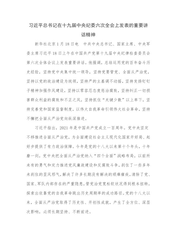 新华社北京 1 月 18 日电 中共中央总书记、国家主席、中央军委主席习近平 18 日上午在中国共产党第十九届中央纪律检查委员会第六次全体会议上发表重要讲话。