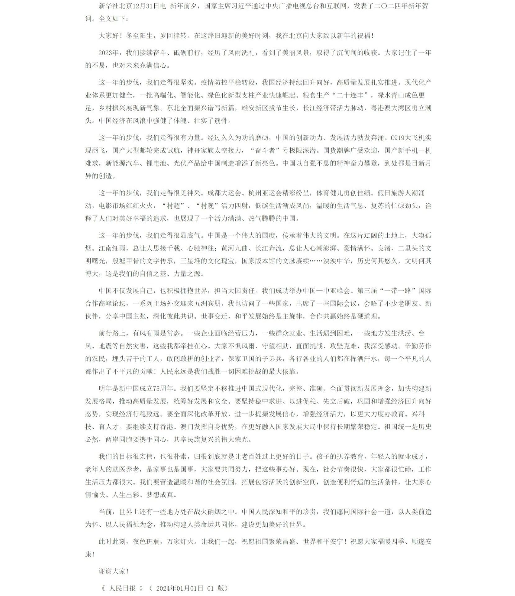 国家主席习近平发表二〇二四年新年贺词
