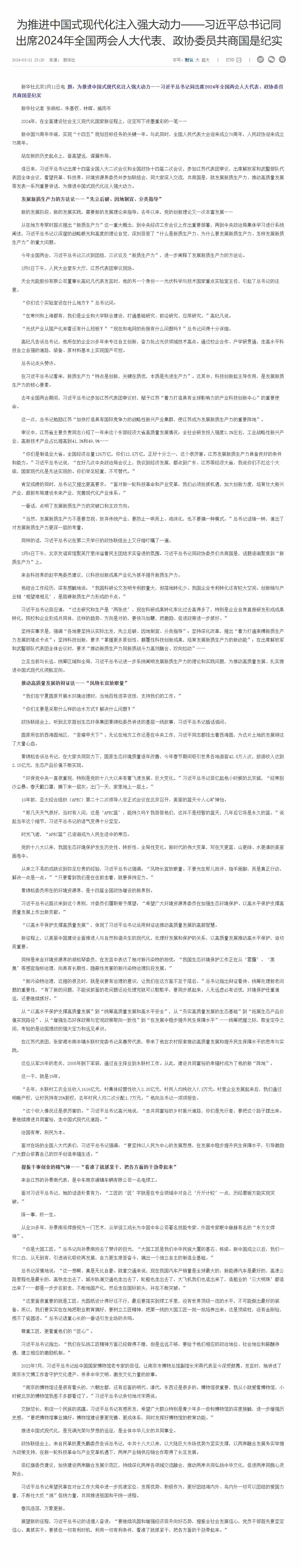 :为推进中国式现代化注入强大动力——习近平总书记同出席2024年全国两会人大代表、政协委员共商国是纪实。