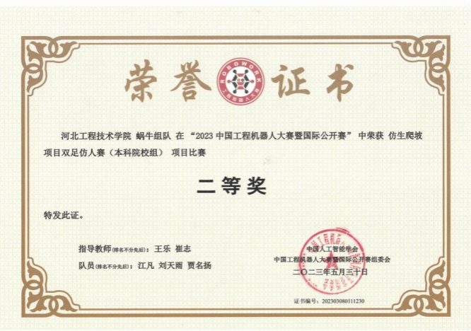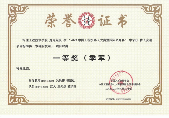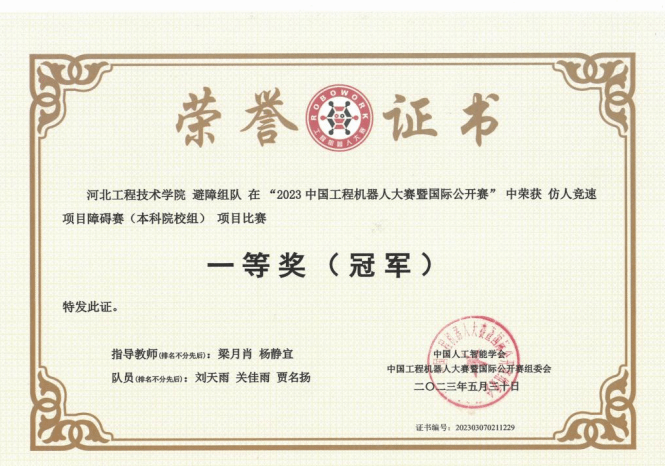 beat365亚洲版官网组织师生报名参加,经过现场激烈角逐,三个参赛项目均荣获国家级奖励,其中,在仿人竞速项目障碍赛中,由梁月肖老师和杨静宜老师指导的避障组(刘天雨、关佳雨、贾名扬)荣获一等奖(冠军),在仿人竞速项目标准赛中,由吴洪伟老师和崔建弘老师指导的竞走组(江凡、王天然、董子瑜)荣获一等奖(季军),在仿生爬坡项目双足仿人赛中,由王乐老师和崔志老师指导的蜗牛组(江凡、刘天雨、贾名扬)荣获二等奖。