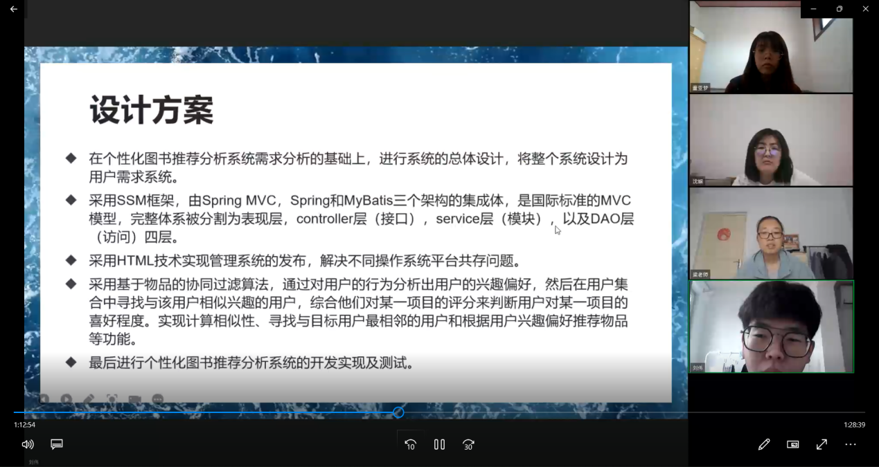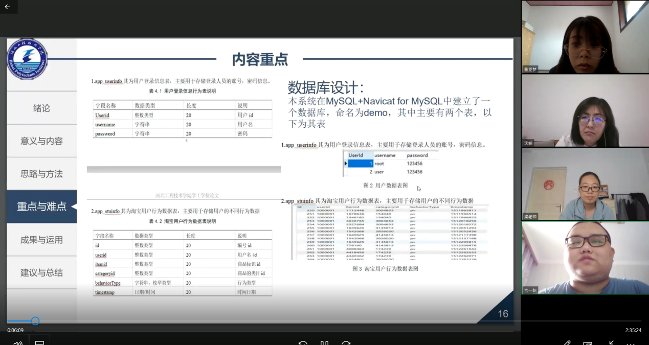 参加答辩的同学早已准备就绪,等待大学期间最后一场实战性的“考试”。他们在答辩前都经过了论文选题、中期检查、论文指导、论文审查等几个阶段精心的准备。此次毕业答辩分成12组,每组有10-12名同学,4-5名答辩评委老师。每个答辩小组有一位答辩小组组长统筹管理,一名答辩小组秘书收集学生毕业答辩相关材料和毕业答辩钉钉群的管理,其他答辩评委老师在答辩前查阅毕业论文和答辩中提出相关问题。此次毕业答辩采取线上钉钉会议模式,在答辩的前一天,各答辩小组秘书对参加答辩同学的设备进行测试,以保证毕业答辩顺利进行。毕业答辩主要分为两个环节。第一个环节是答辩陈述,答辩同学简单介绍设计思路和方案,详细介绍设计内容和完成的功能,简单介绍设计待解决的问题及改善。第二个环节是提问环节,答辩评委老师将根据毕业论文的内容提出相关问题,由答辩同学现场回答。在答辩过程中,学生们选题广泛,都阐述了自己的毕业设计的思路和内容。随后提问环节中,同学们回答简明准确,虽有不足,但都得到老师的认可,评委老师也提出了针对性的意见和要求。