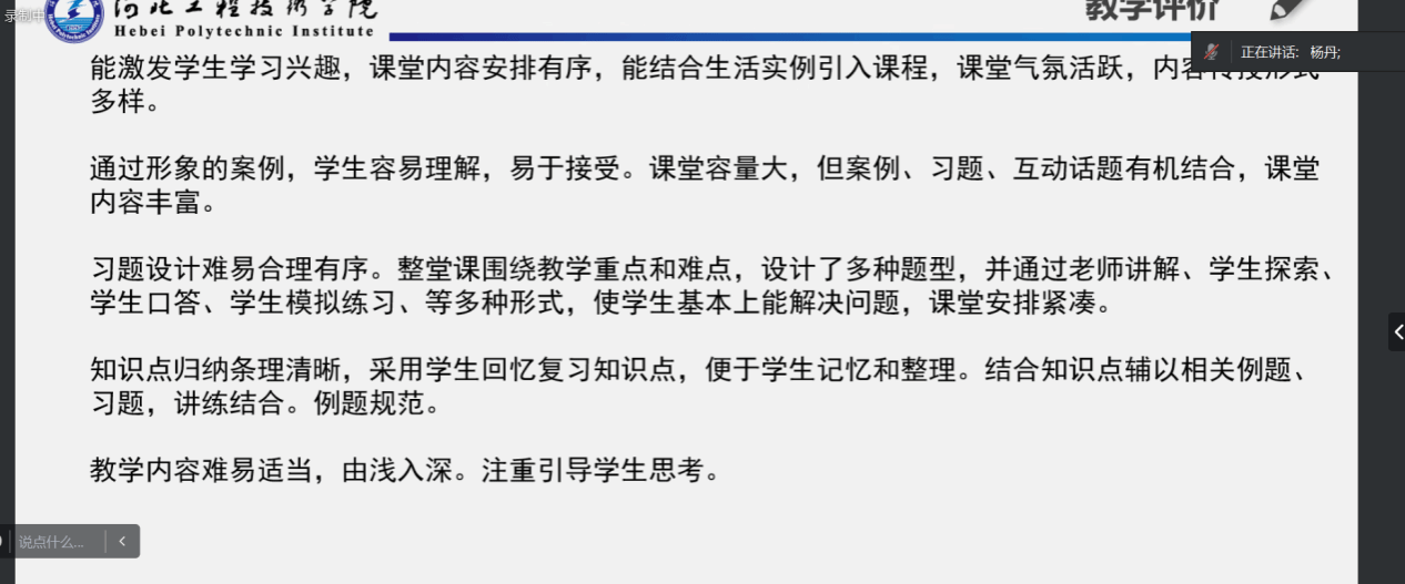 本次比赛采用线上方式进行,邀请beat365教学副院长林海霞、孙劼和各系主任担任评委。说课要求重点突出课堂教学创新的理论依据、实施过程以及效果。教学要求教学理念符合新课程改革,课堂教学创新元素表现充分,语言简练,表意准确。