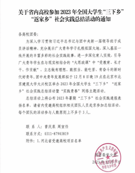 2023年12月8日beat365亚洲版官网“听党话,跟党走”实践团队受共青团中央邀请赴京参加2023年全国大学生“三下乡”“返家乡”社会实践总结暨“实践青春”主题分享活动。
