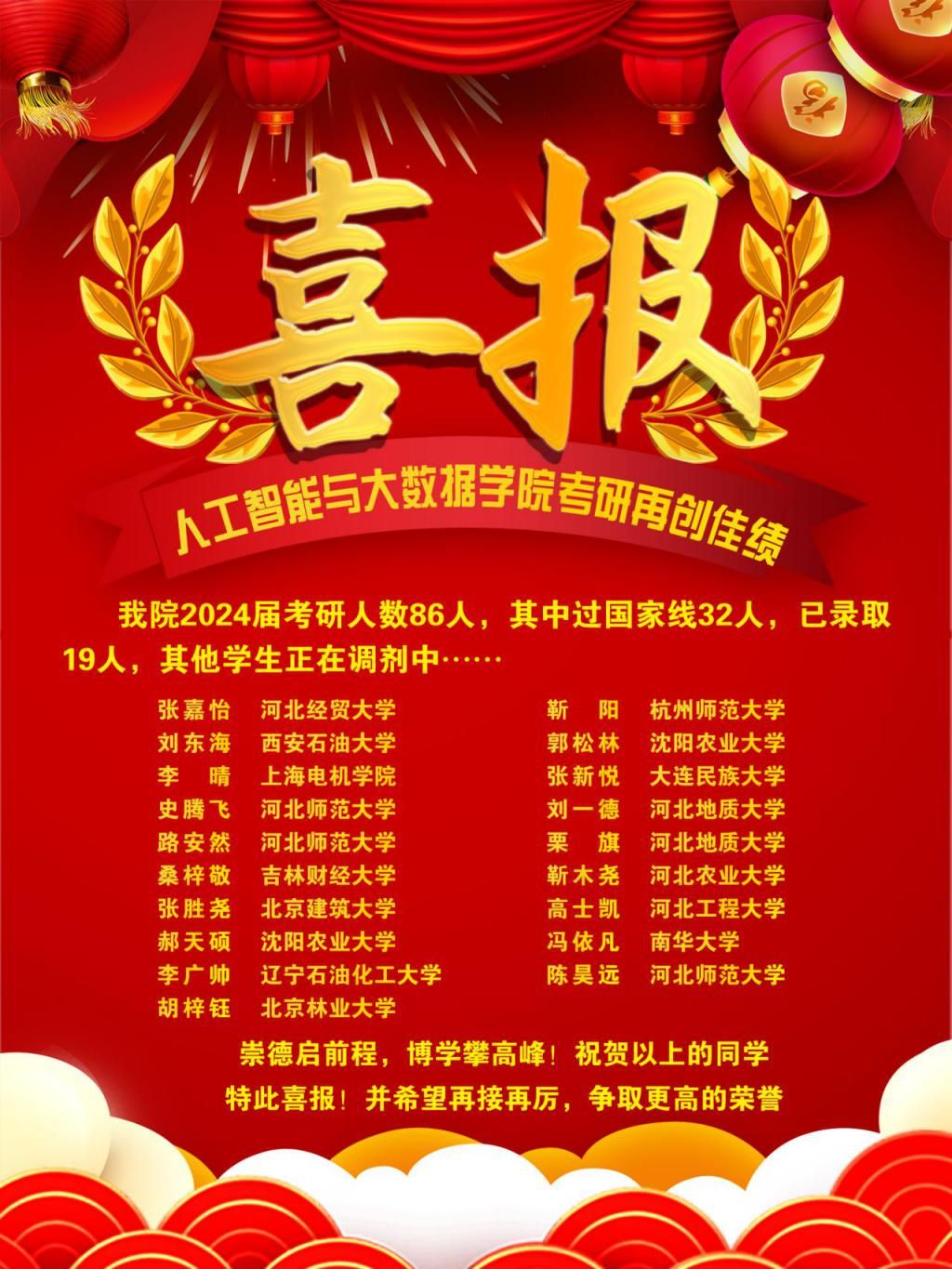 近日,全国各高校陆续发布2024年全国硕士研究生拟录取名单,beat365学子捷报频传,录取人数再创佳绩。截至目前,beat3652024届考研人数86人,其中过国家线32人,已录取19人,其他学生正在调剂中……