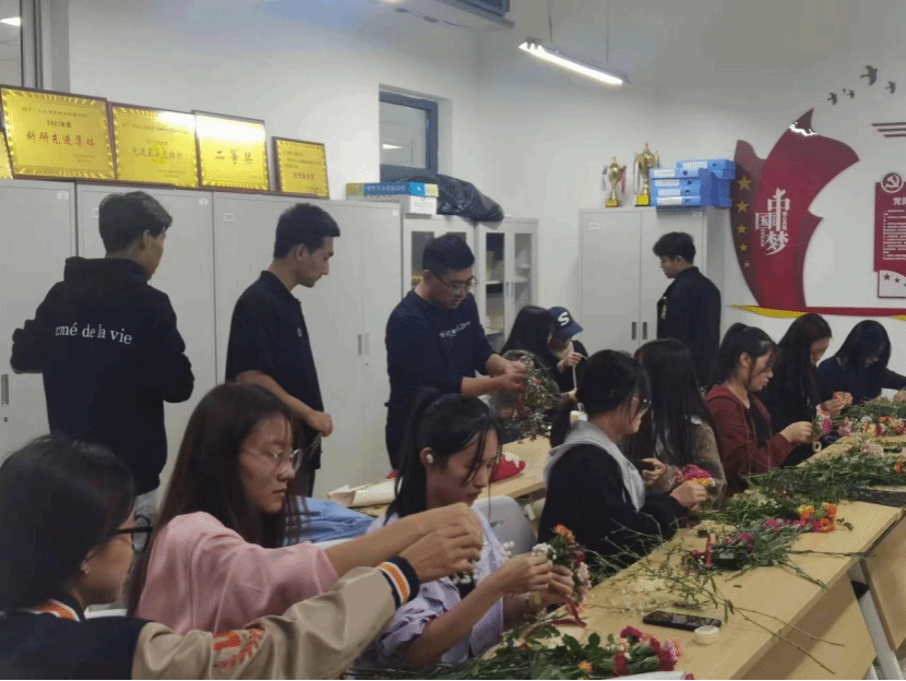 十月秋风劲,校园热似火。为了激发学生们对运动会的热情和期待,展现了学院师生团结合作、奋发向前的精神风貌以及学校的团结和力量,特此,各社团干部在beat365亚洲版官网党总支书记兼学管副院长尹钧的带领下于2023年10月18日在次教216为运动会前筹备编织花环。