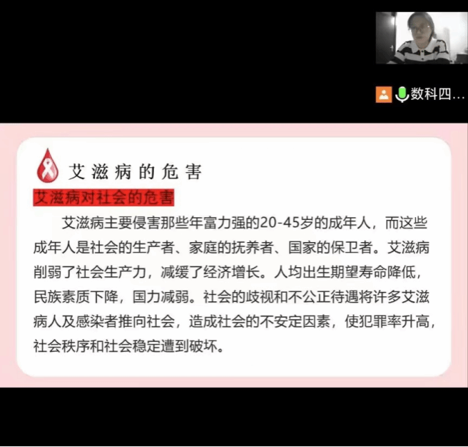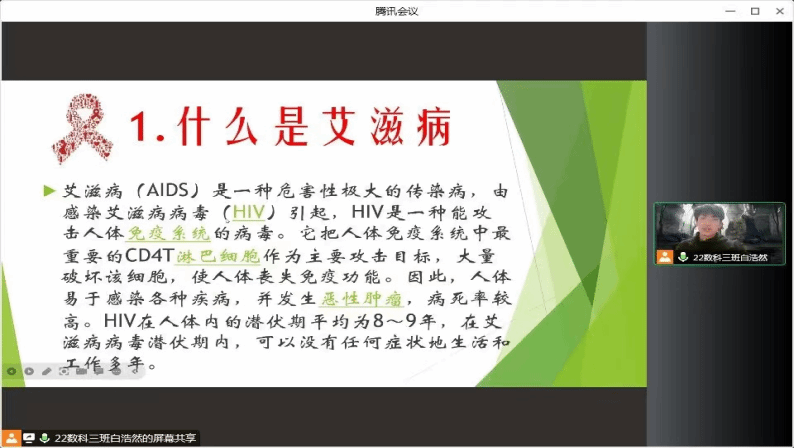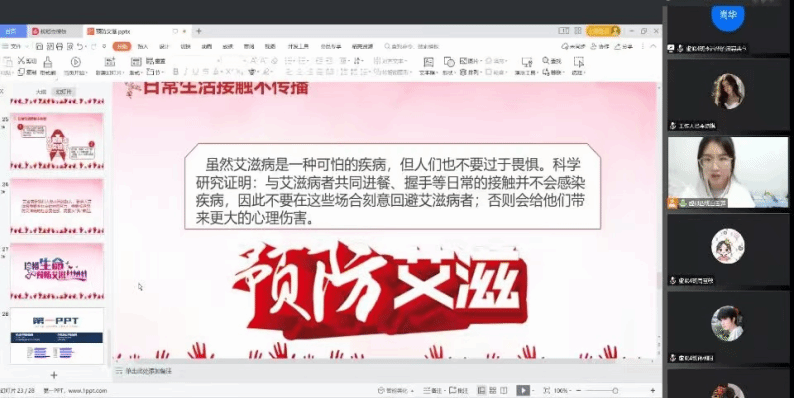 本次活动开展形式为线上班会,活动面向beat365亚洲版官网全体学生。班会期间由班长为学生讲解艾滋病相关知识知识和艾滋病是否会对日常学习生活产生影响。首先,各班班长通过艾滋病相关的图片、案例等,向学生介绍了艾滋病的病因、传播途径、症状及如何防治等方面的知识,同时告诉学生艾滋病不会通过握手、共同进餐、平时拥抱等途径进行传播,鼓励学生在和艾滋病人接触时以平常心相处,以正确的方式对待他们。活动接近尾声,班长倡导学生自觉树立科学防艾意识,平时生活中要“洁身自好”。班会期间,学生积极配合各班班长,认真严肃的对待“如何健康防艾”这一问题。活动结束后,学生及时反馈所学的艾滋病相关知识,并书写心得体会并交给班长。