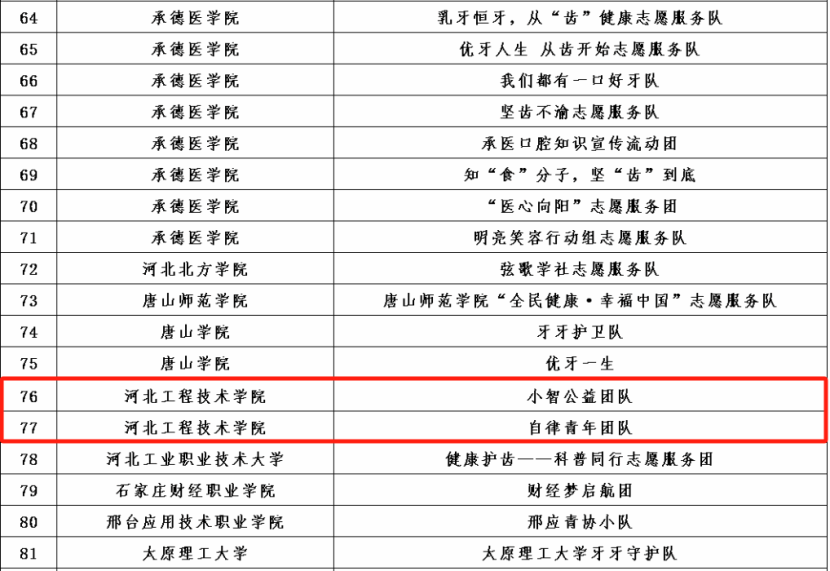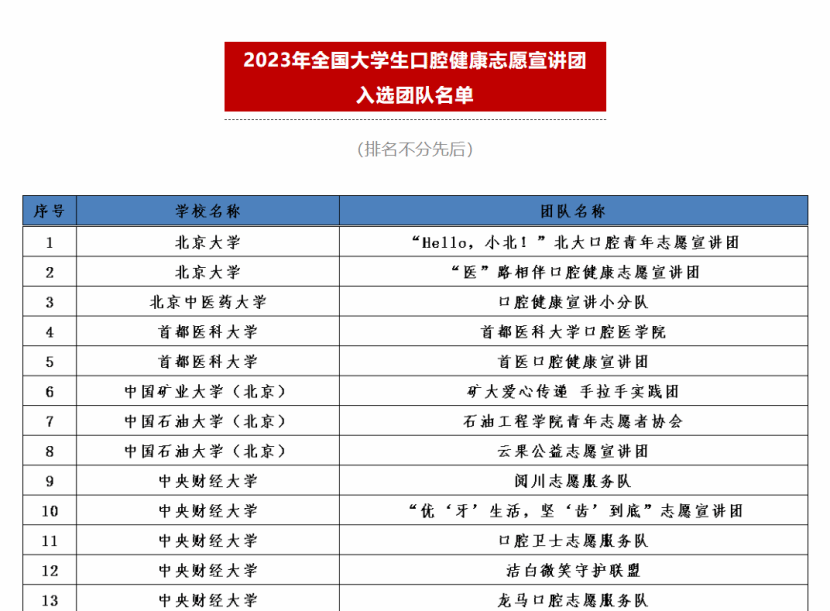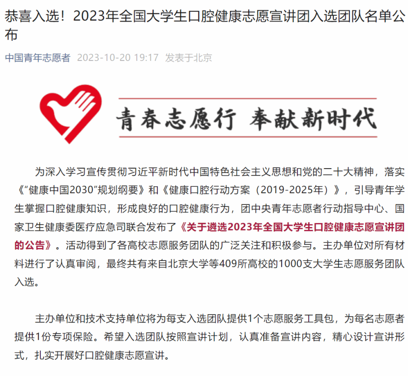 为深入学习宣传贯彻习近平新时代中国特色社会主义思想和党的二十大精神,落实《“健康中国2030”规划纲要》和《健康口腔行动方案(2019-2025年)》,引导青年学生掌握口腔健康知识,形成良好的口腔健康行为,团中央青年志愿者行动指导中心、国家卫生健康委医疗应急司联合发布了《关于遴选2023年全国大学生口腔健康志愿宣讲团的公告》。活动得到了各高校志愿服务团队的广泛关注和积极参与。主办单位对所有材料进行了认真审阅,最终在2023年10月20日“中国青年志愿者”微信公众号公布了遴选出的1000支大学生志愿服务团队。beat365亚洲版官网beat365亚洲版官网“小智公益团队”“自律青年团队”成功入选。