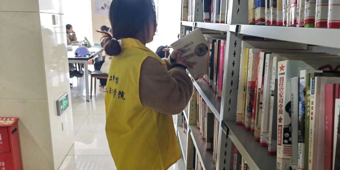 志愿者们忙碌的身影在一排排书架中穿梭,奉献精神也在一本本书籍中传递。