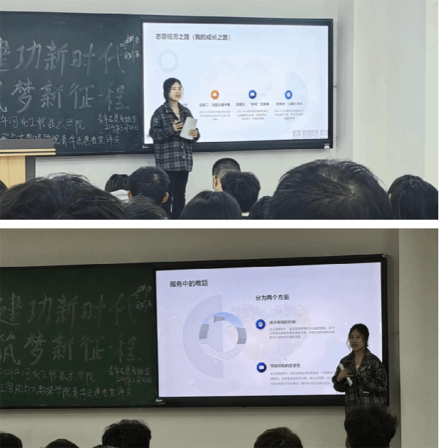 本次活动,主讲人康佳硕为大家详细讲述了自己志愿的初心与契机、如何走上漫长的志愿之路以及在工作之中的收获。主讲人康佳硕分享了自己志愿活动的记录,直观展示了志愿服务的过程。同时,主讲人强调志愿活动中遇到的难题是语言障碍和情绪控制,它们会严重影响志愿活动的质量和效率,并特别提醒学生们要着重注意“克服语言障碍,做好情绪的控制”,这样才能收获更多经验,成就出更好的自己。