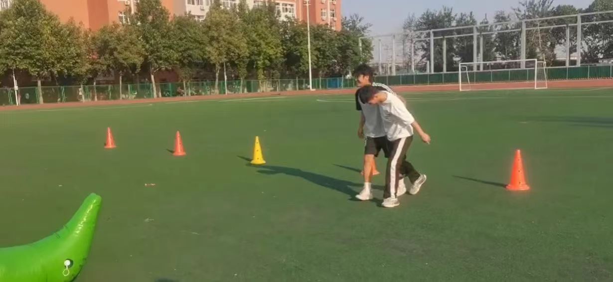紧接着进行的是“两人三足”趣味项目。队员们并排站立,两人用绳子或布条绑住两人内侧的小腿。当“毛毛虫小组”抵达操场的中圈起跑线时,参与“两人三足”的队员们迅速完成绑腿动作,并全力冲向设置在对面的标志处,然后迅速折返这个项目通过考验选手们的速度与默契度,进而展现出了队内团结一心的精神风貌。