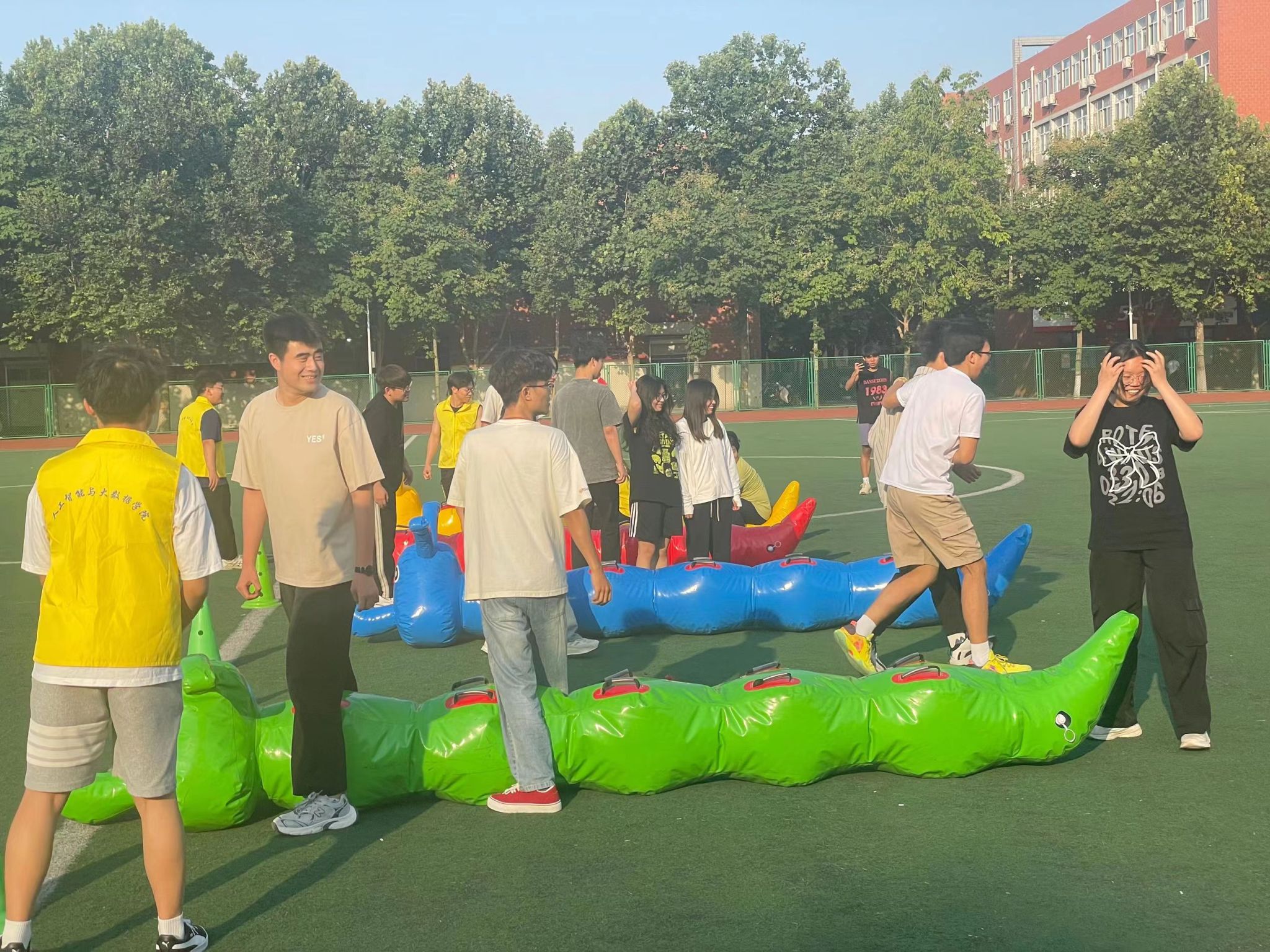 首先进行的是“毛毛虫”趣味项目,十五个社团分成若干小组,每组五人,学生们纷纷骑坐在色彩斑斓的充气毛毛虫道具上,双手紧握固定把手,蓄势待发。随着裁判一声令下,各组成员齐心协力,使毛毛虫道具在跑道上快速移动,犹如一条条彩色的巨龙在草地上穿梭。活动现场气氛高涨,经过激烈的角逐,用时最短的队伍取得了冠军,赢得了观众的阵阵喝彩。