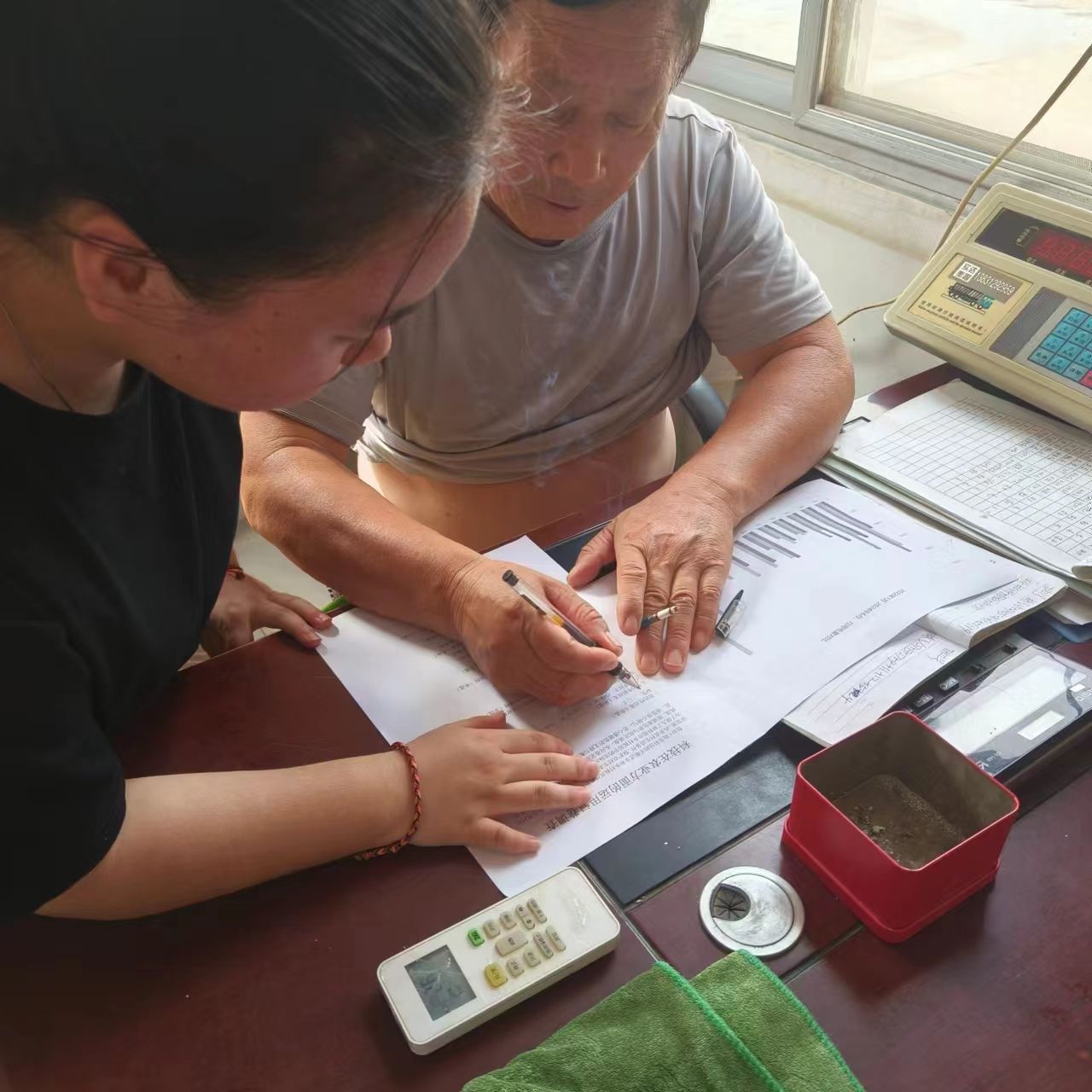 团队成员指导农户填写科技在农业方面的调查问卷
