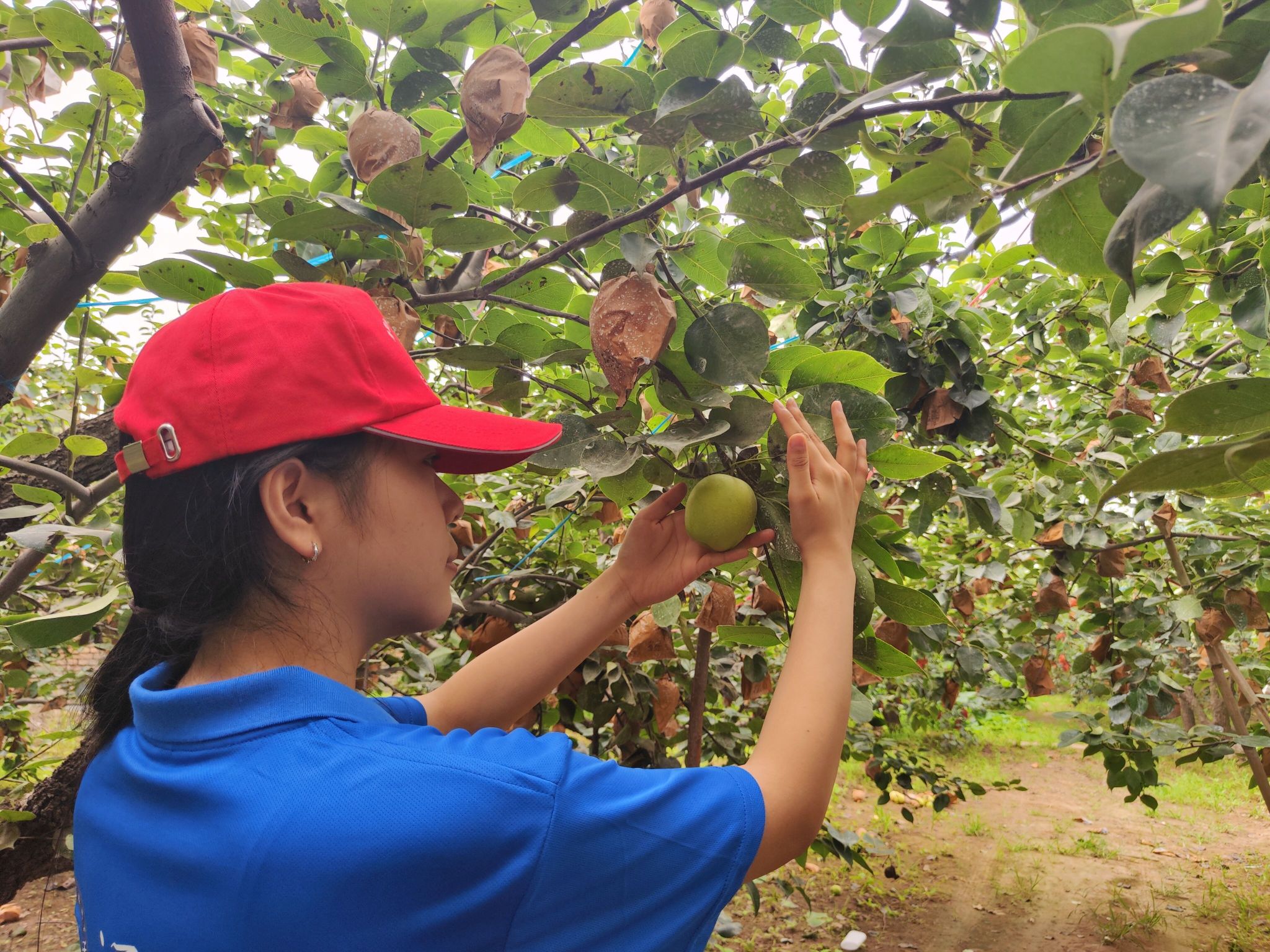 (三)林业篇:乡村智慧“星”暑期社会实践团四名成员分别在石家庄市赵县雪花梨基地、石家庄市正定县西平乡西杜村的毛桃林、廊坊市文安县的蟠桃林、石家庄市井陉矿区的中华大寿桃林进行实地考察,了解、学习科技如何推进林业的发展从而促进乡村振兴,结合所学专业,思考是否可以为林业的发展提供新思路。