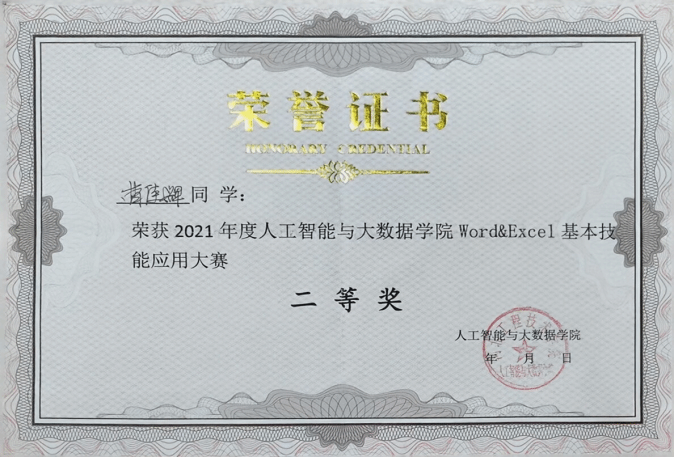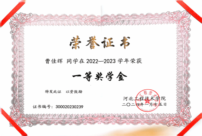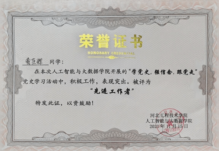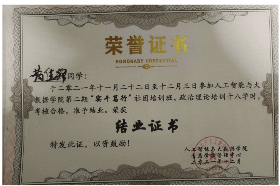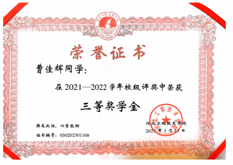 2021级数据科学与大数据技术三班的曹佳辉,女,积极分子,在自身的不懈努力以及老师、同学的热心帮助下,我在各方面获得了显著的进步和一定的成就。在这三年中获得荣誉:校级及以上13项,其中国家级及省级奖项7项;院级奖项11项。