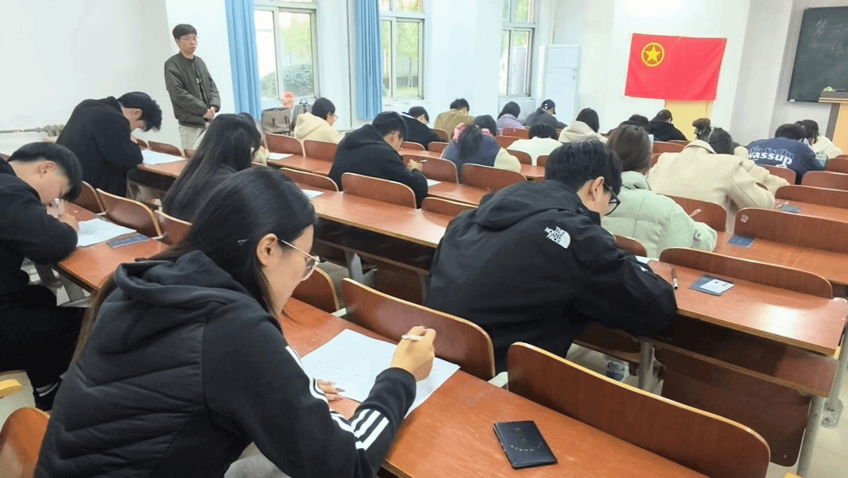拟推荐发展对象结业考核全面而深入地覆盖了所有学习要点,实现了对知识的综合考量。考试在学生代表的协助下有序进行,考场纪律严明,氛围安静。学生们专注作答,展现了对党组织的热切向往。监考人员严格履责,确保考试公平公正。