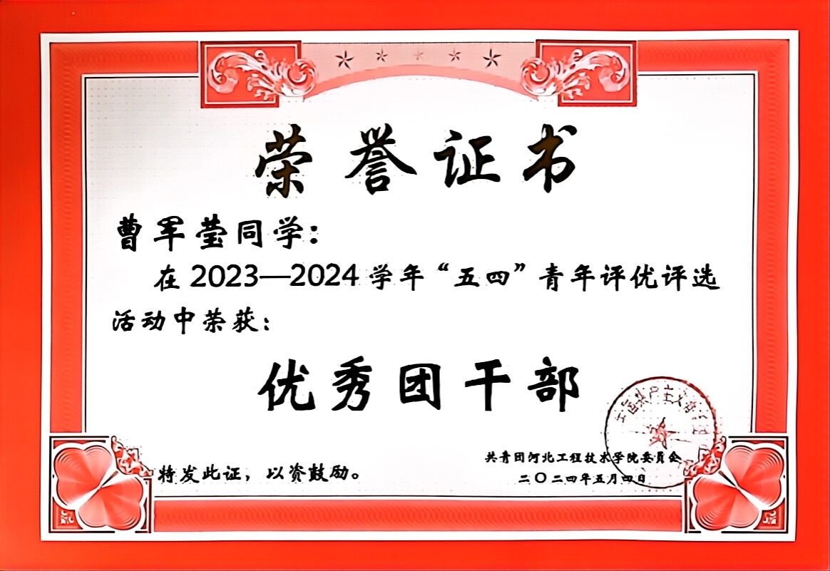 2023-2024学年“五四”青年评优评选优秀团干部。
