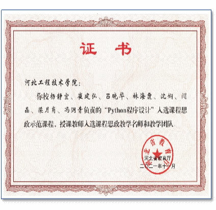 3.“python程序设计”课程被认定为河北省课程思政示范课,教学团队获得河北省课程思政教学示范团队。